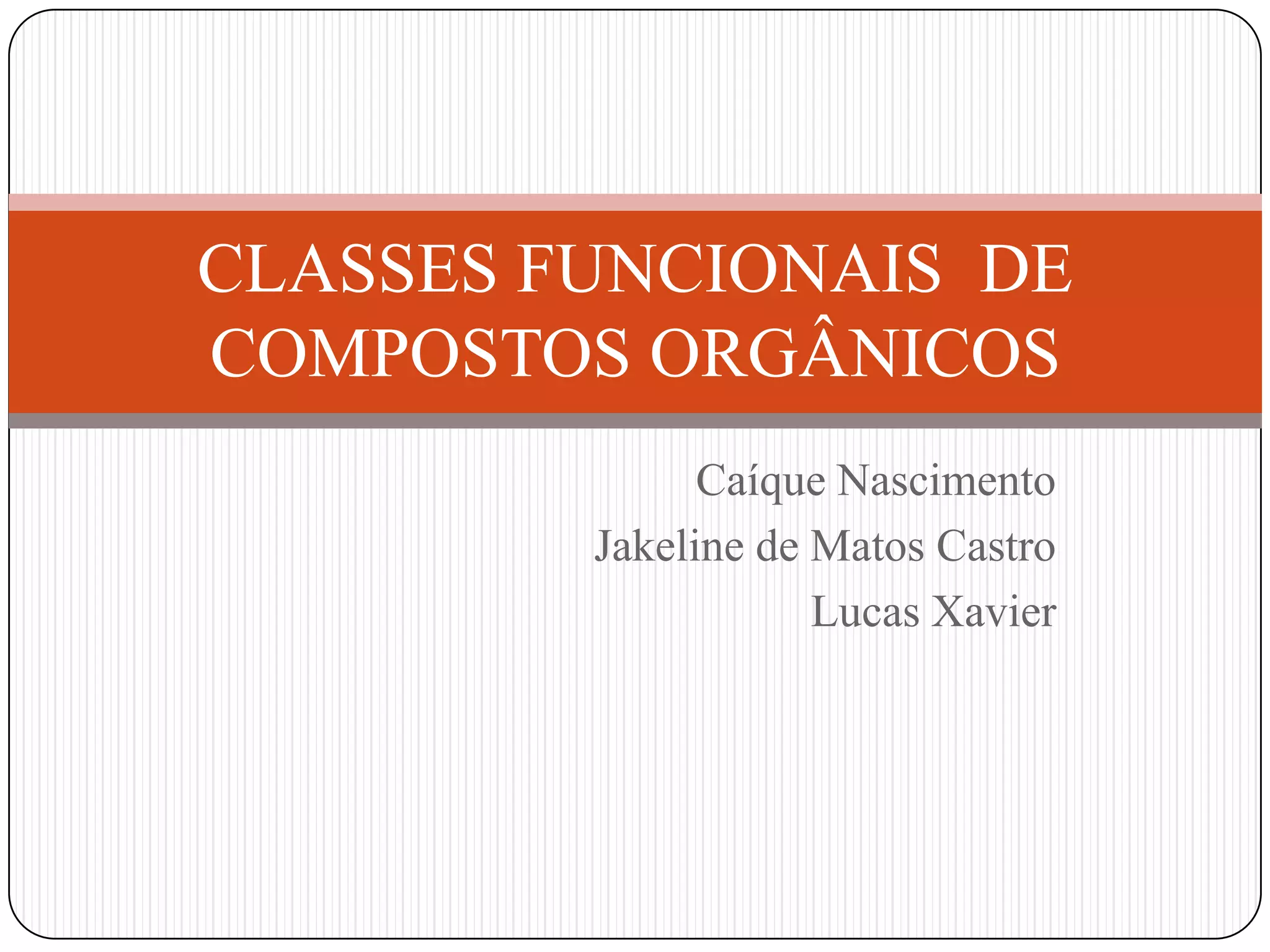 O documento discute as classes funcionais de compostos orgânicos, definindo-os como compostos que contêm carbono. Explica que esses compostos podem formar cadeias através da união de átomos de carbono e que possuem grupos funcionais que determinam suas propriedades. A nomenclatura orgânica é baseada no número de átomos de carbono, tipo de ligação e função química.
