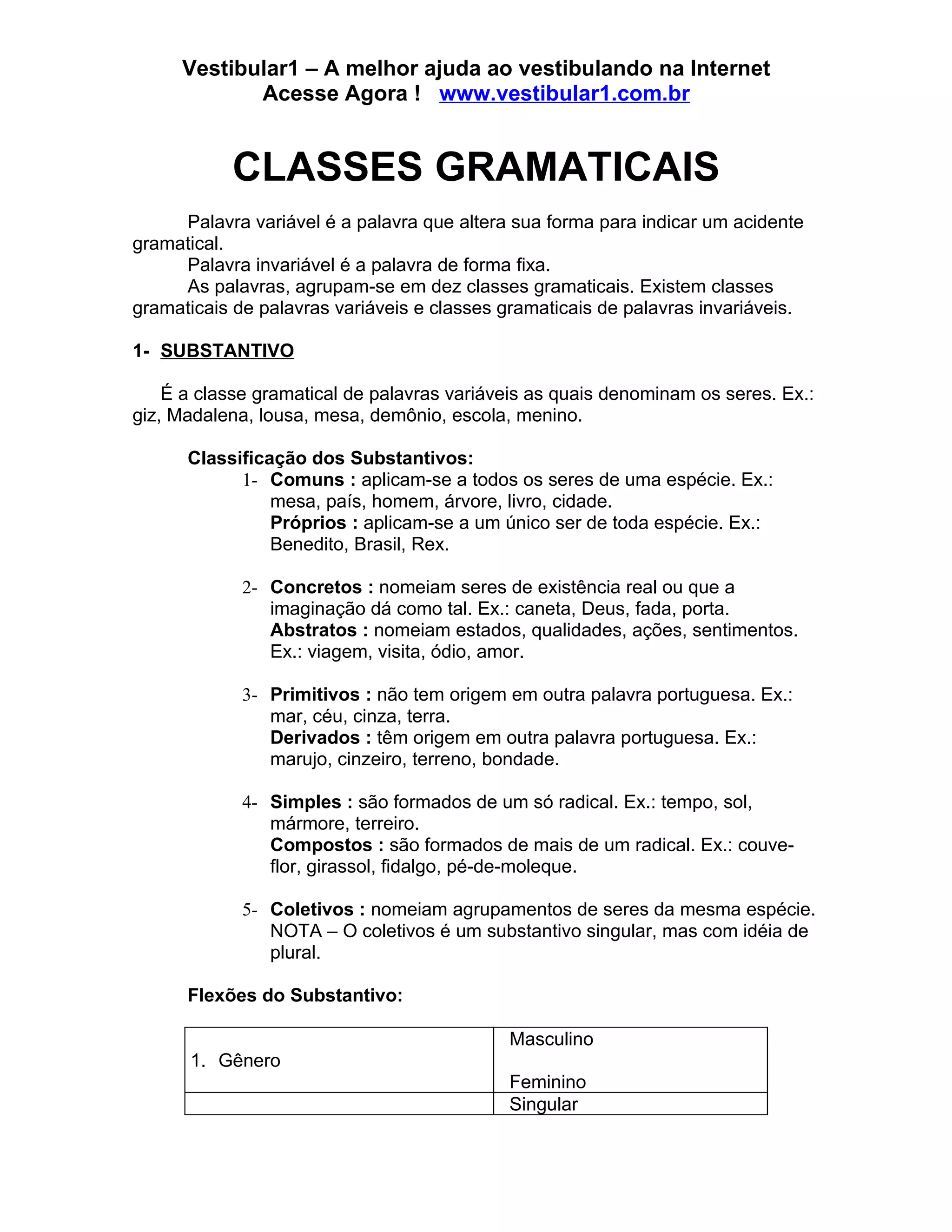 O documento fornece informações sobre as classes gramaticais da língua portuguesa, incluindo substantivos, artigos, adjetivos, numerais, pronomes, advérbios e preposições. Fornece detalhes sobre a classificação e flexões de cada classe gramatical.