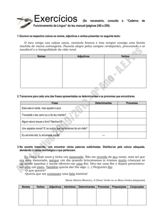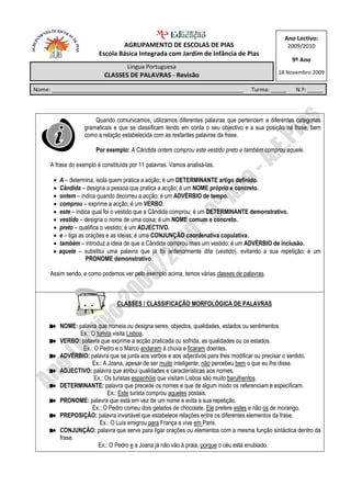 Este documento fornece instruções sobre classes de palavras em Português para alunos do 9o ano. Ele explica os diferentes tipos de palavras como nomes, verbos, adjetivos e fornece exemplos de cada um. Exercícios são fornecidos para que os alunos identifiquem as classes de palavras em frases.