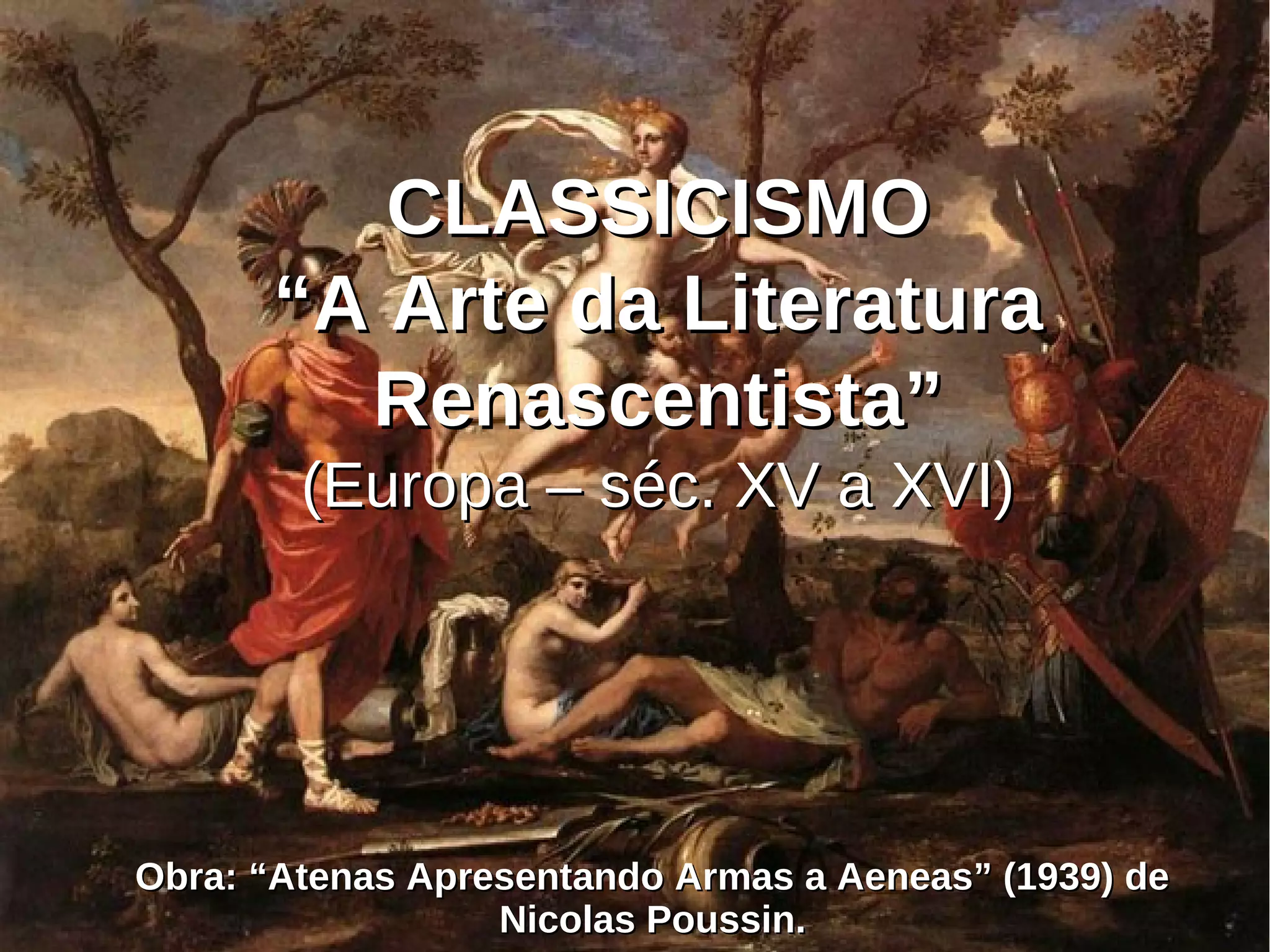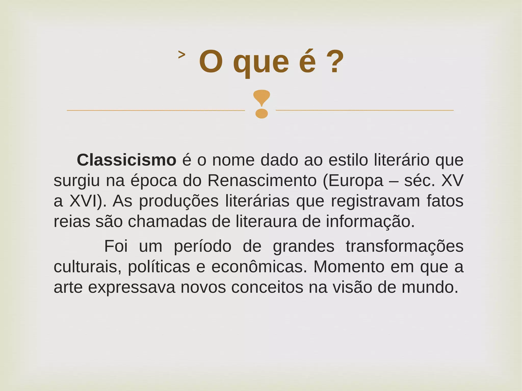 O documento descreve o Classicismo como o estilo literário surgido no Renascimento entre os séculos XV e XVI na Europa. As obras da época expressavam novos conceitos sobre o mundo e valorizavam a perfeição formal, a razão e a cultura clássica greco-romana.