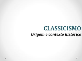 O documento descreve o Classicismo, incluindo sua origem no século XIV na Europa, seu auge nos séculos XV e XVI, e seu fim em 1580. Ele também detalha as características do Classicismo como racionalismo, universalismo e perfeição formal, e lista os principais autores como Camões, Sá de Miranda, Gil Vicente e suas obras mais importantes.
