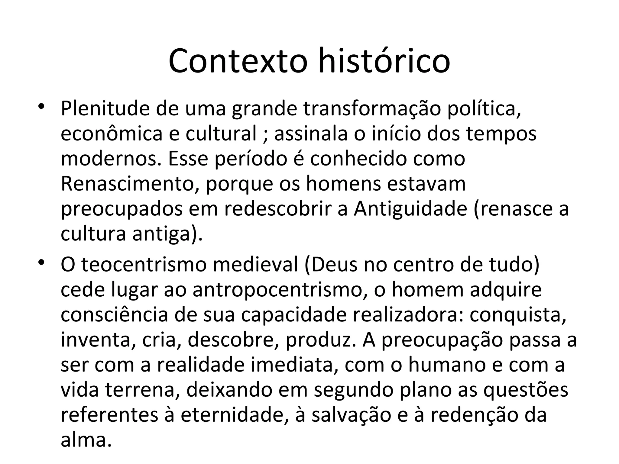 O Renascimento marcou uma grande transformação política, econômica e cultural na qual o homem passou a ser o centro, em vez de Deus. O homem renascentista buscava entender o mundo pela razão e cultuava a cultura greco-latina. Esse período também viu o enfraquecimento do feudalismo e o surgimento da burguesia.