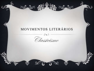 O documento descreve o movimento literário do Classicismo no Brasil e em Portugal, incluindo suas origens na cultura greco-romana, características como racionalismo e influência clássica, e principais autores como Camões. Também discute como o Classicismo se desenvolveu no Brasil colonial de forma limitada devido às condições iniciais da colonização.