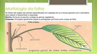 O documento descreve as classificações principais das folhas de plantas: (1) Folhas podem ser simples ou compostas, dependendo de sua divisão; (2) A disposição das nervuras define a nervação como paralelinérvea, peninérvea ou palminérvea; (3) A forma, inserção e recortes da borda também são usados para classificar folhas.