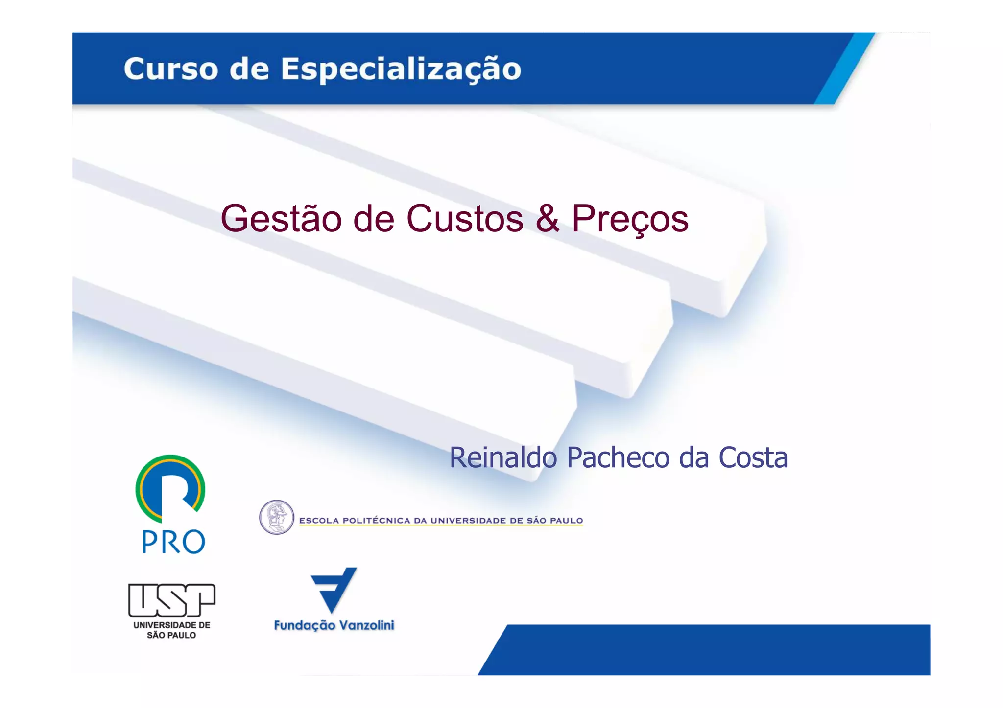 1. O documento discute gestão de custos e preços, incluindo classificação de custos, sistemas de custeio e fatores que influenciam a definição de preços.