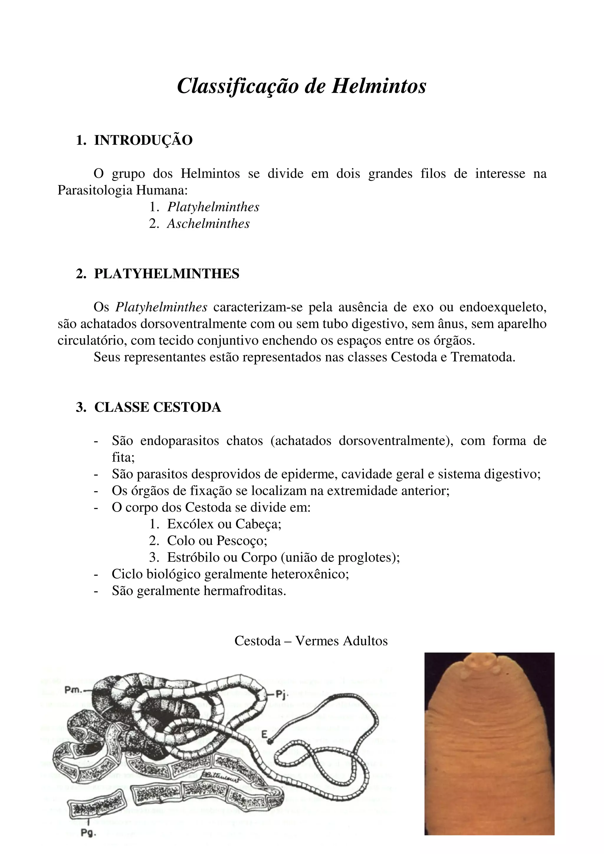 O documento classifica os helmintos em dois filos principais: Platyhelminthes e Aschelminthes. Os Platyhelminthes incluem as classes Cestoda e Trematoda, que são achatados e sem tubo digestivo completo. Os Aschelminthes incluem apenas a classe Nematoda, que são alongados e cilíndricos com tubo digestivo completo.