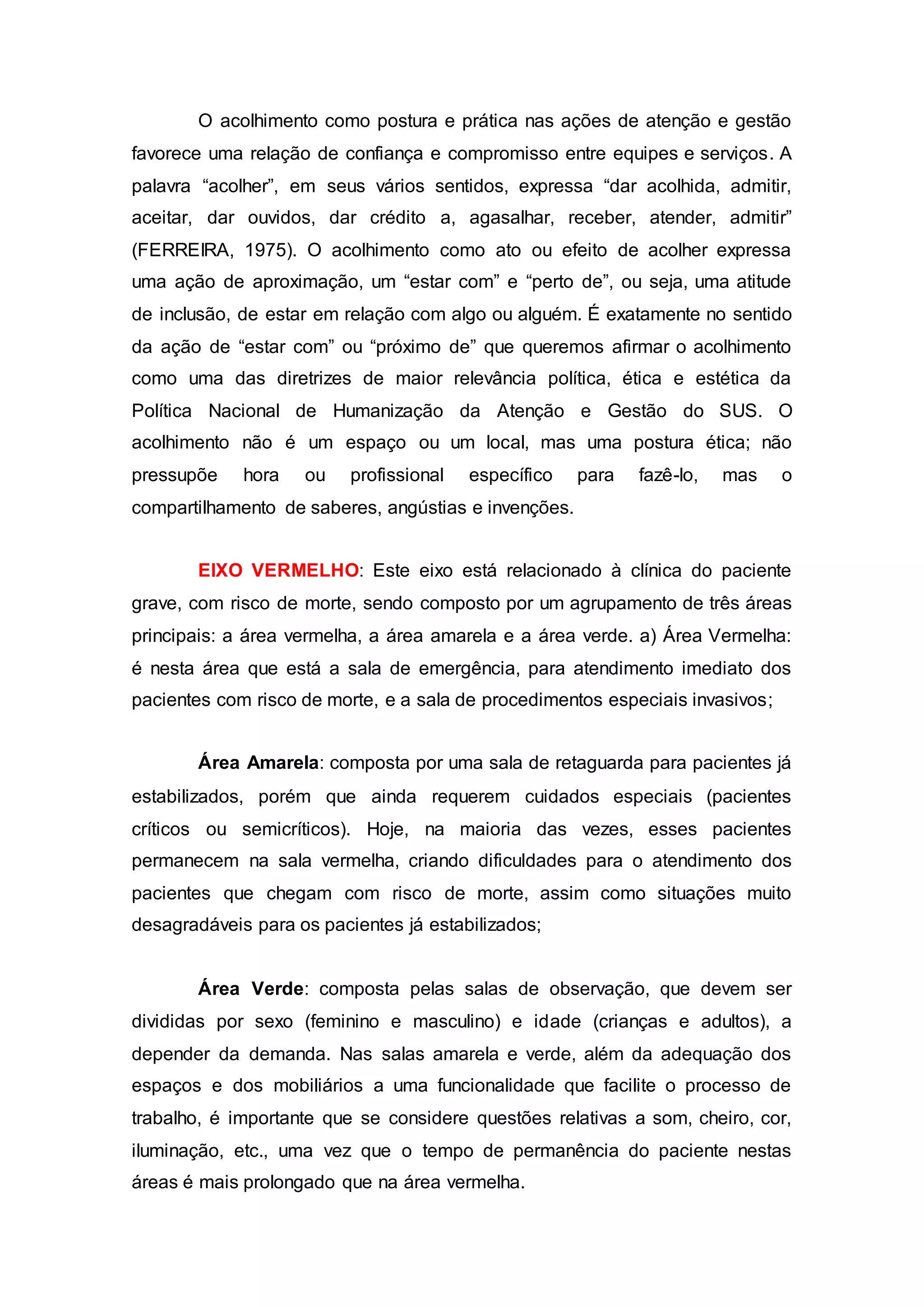 O documento discute a importância do acolhimento nos serviços de saúde, definindo-o como uma postura ética de compartilhamento entre equipes. Também descreve os eixos vermelho e azul em unidades de emergência, com diferentes áreas para atendimento de pacientes de acordo com gravidade e fluxos claros de atendimento.