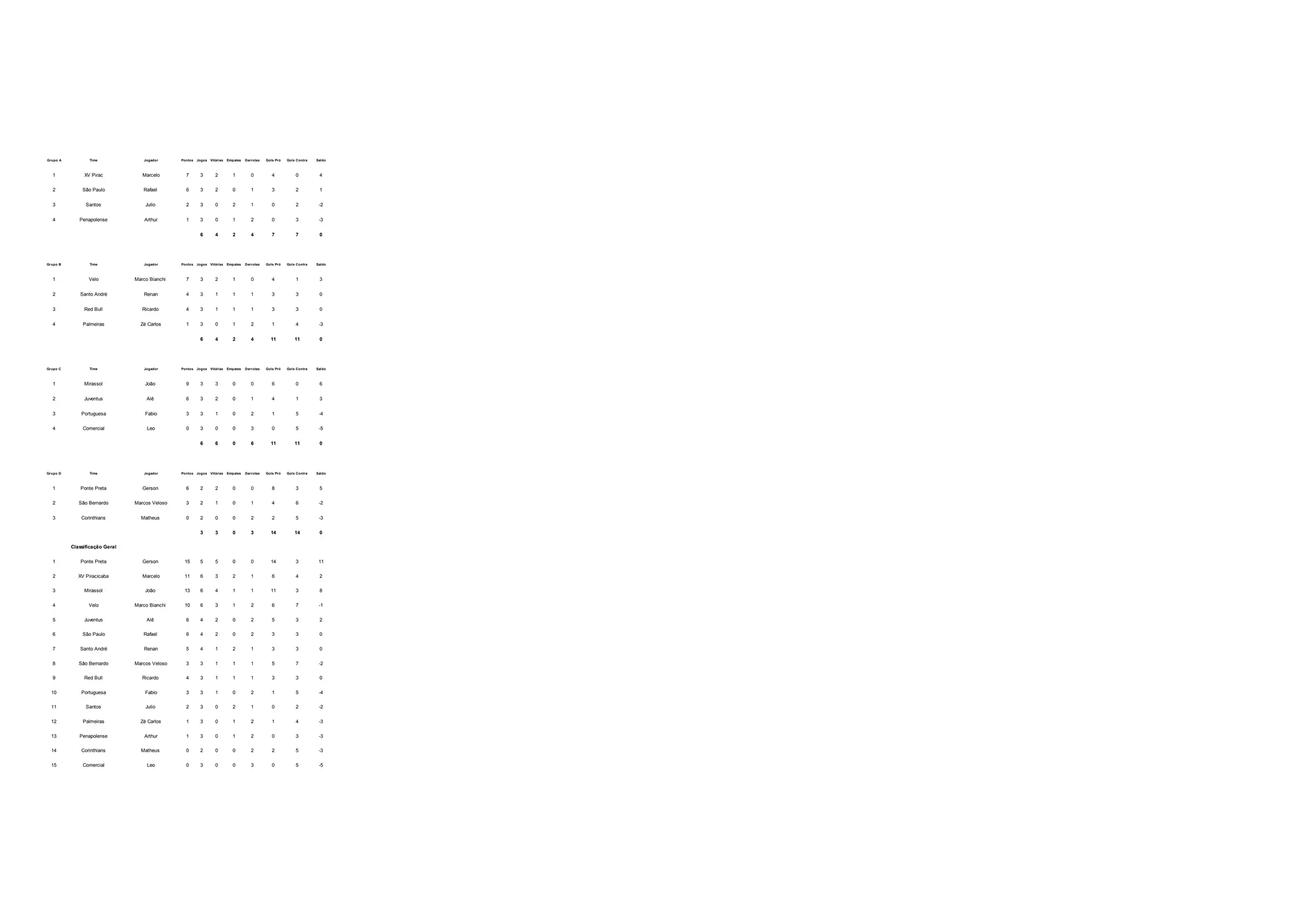 O documento apresenta os resultados de 15 times divididos em 4 grupos em um campeonato de futebol. O Ponte Preta lidera a classificação geral com 5 vitórias, 11 gols pró e saldo de 11 gols. O Mirassol está em 3o lugar com 4 vitórias e 1 empate, tendo marcado 11 gols. O Comercial está na lanterna sem nenhum ponto conquistado.