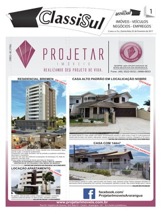 O documento lista vários imóveis e terrenos à venda e para alugar em Araranguá, incluindo apartamentos, casas, e terrenos, fornecendo detalhes como número de quartos, preços, e contatos.