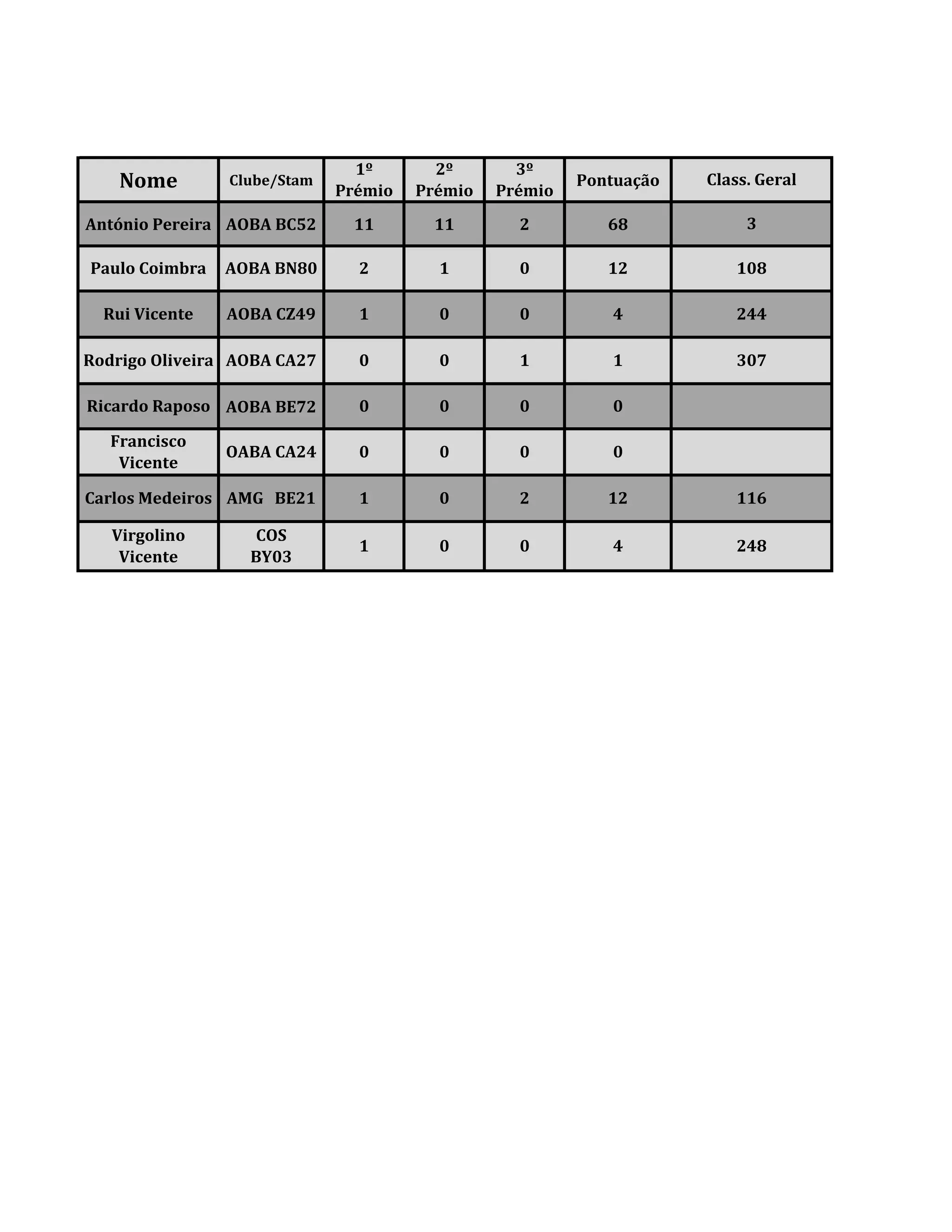 Este documento apresenta os resultados de uma competição dividida em três prémios, mostrando o nome do competidor, clube, pontuação em cada prémia e classificação geral, com António Pereira do AOBA BC52 em primeiro lugar na classificação geral.
