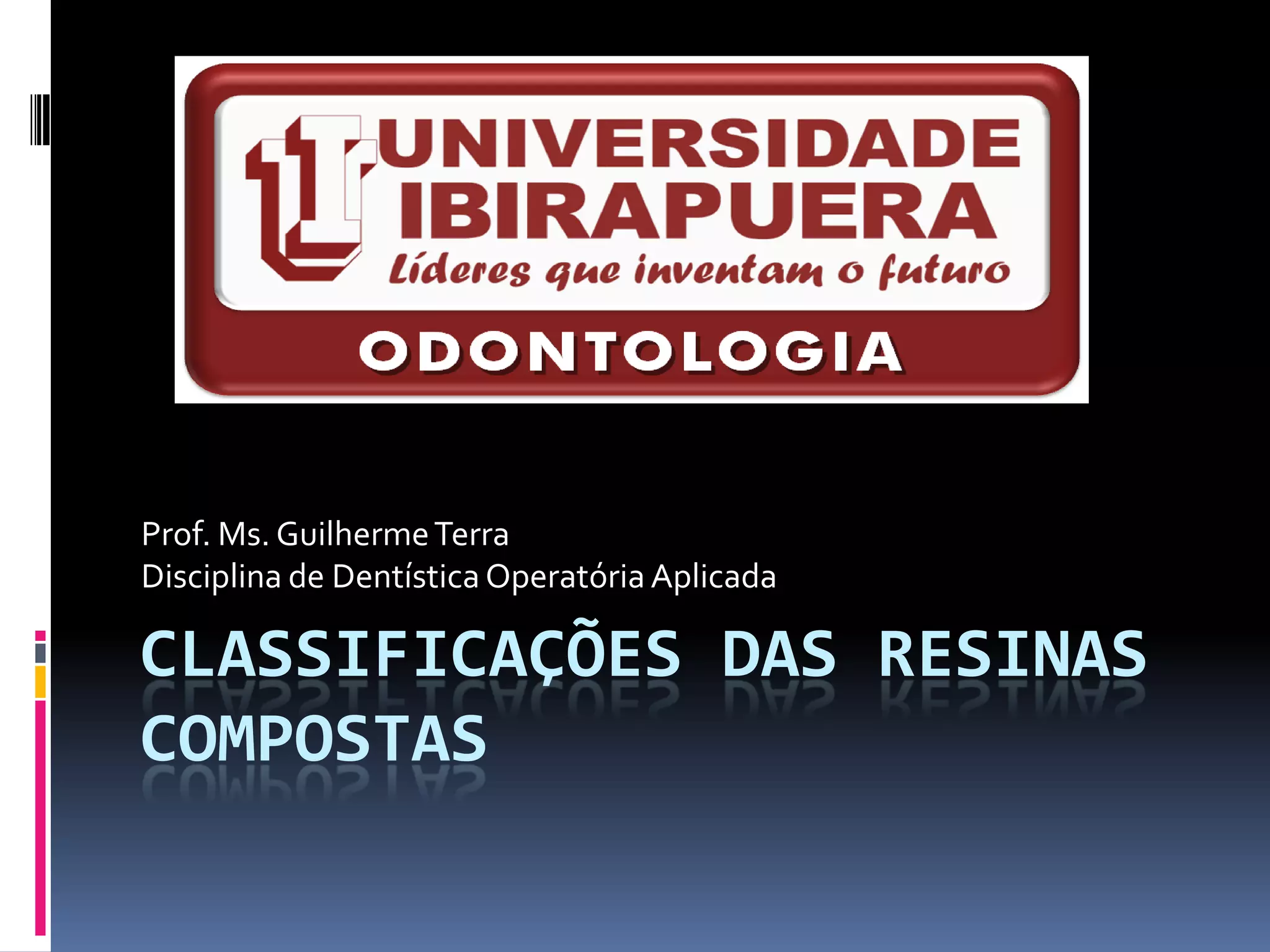 Este documento classifica e descreve os tipos de resinas compostas, incluindo suas composições, propriedades e aplicações clínicas. Ele discute as classificações de resinas compostas com base em seu sistema de ativação e tamanho de partícula, como macropartículas, micropartículas, híbridas, micro-híbridas e nanoparticuladas. Também aborda propriedades como resistência ao desgaste, lisura superficial, contração de polimerização e radiopacidade.