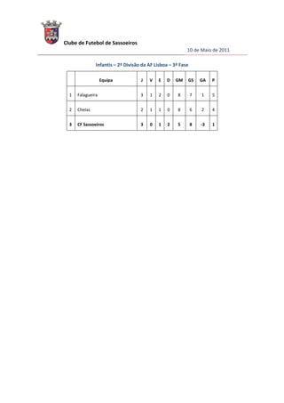O Clube de Futebol de Sassoeiros divulgou os resultados da sua equipa de futsal infantil na 3a fase da 2a Divisão da AF Lisboa, onde se encontra em 3o lugar com 1 ponto, tendo vencido 0 jogos, empatado 1 e perdido 2, marcado 5 golos e sofrido 8.