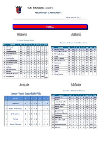 O Clube de Futebol de Sassoeiros divulgou os resultados e classificações do campeonato de futsal em 19 de abril de 2012, com o Shotokai na liderança após vencer seu primeiro jogo por 5-1, e o Leões Porto Salvo em segundo depois de uma vitória por 7-6 sobre o CF Sassoeiros, que perdeu por 6-7 e está em terceiro.