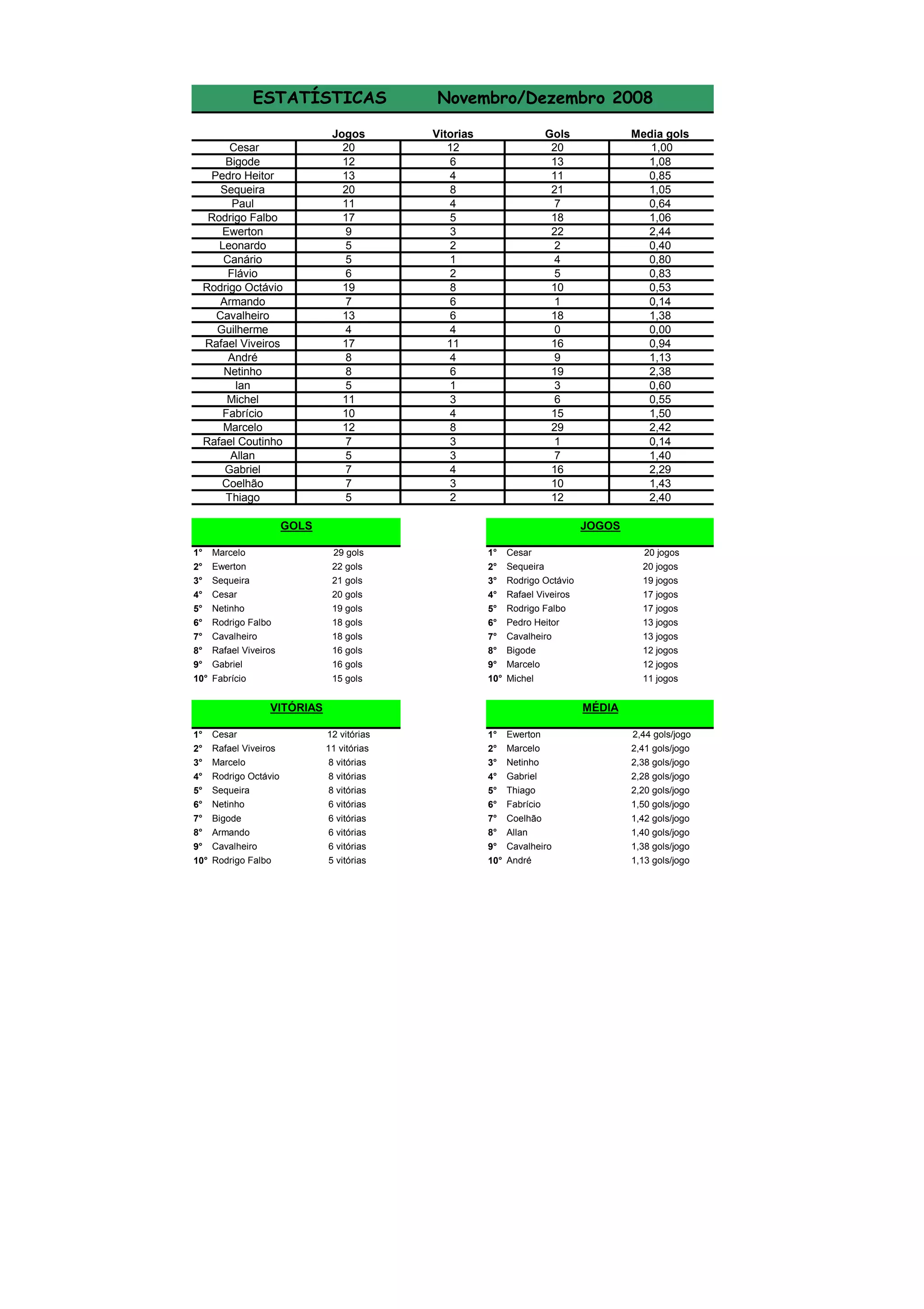 O documento apresenta estatísticas de jogadores em diferentes meses, incluindo número de jogos, vitórias, gols e média de gols. Marcelo foi o artilheiro em vários meses com 20, 25 e 15 gols. Cesar foi um dos jogadores com mais jogos em diversos meses, com destaque para 16 e 18 partidas.