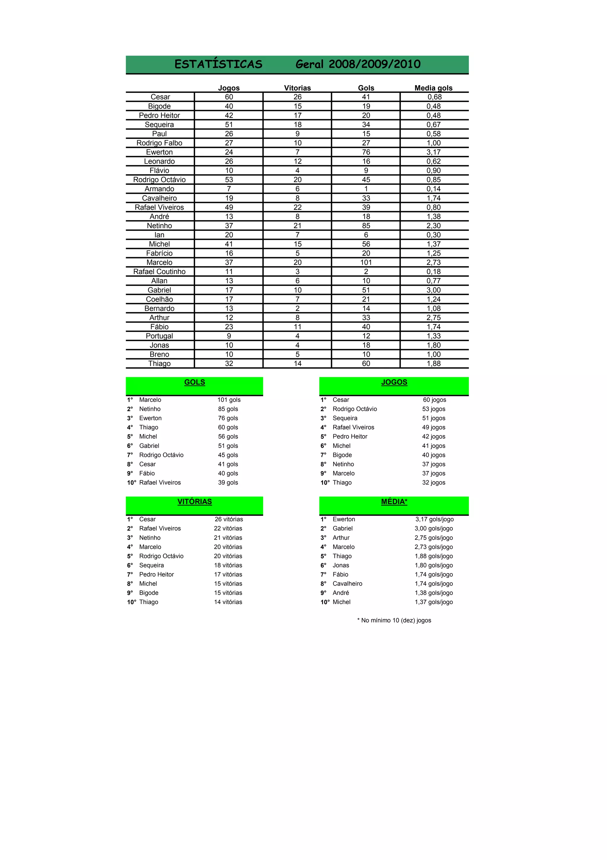 O documento lista as estatísticas de jogos, vitórias e gols de vários jogadores. Marcelo marcou o maior número de gols com 101, seguido por Netinho com 85 gols e Ewerton com 76 gols. Cesar jogou o maior número de jogos com 60, seguido por Rodrigo Octávio com 53 jogos e Sequeira com 51 jogos. Marcelo também teve o maior número de vitórias com 26.
