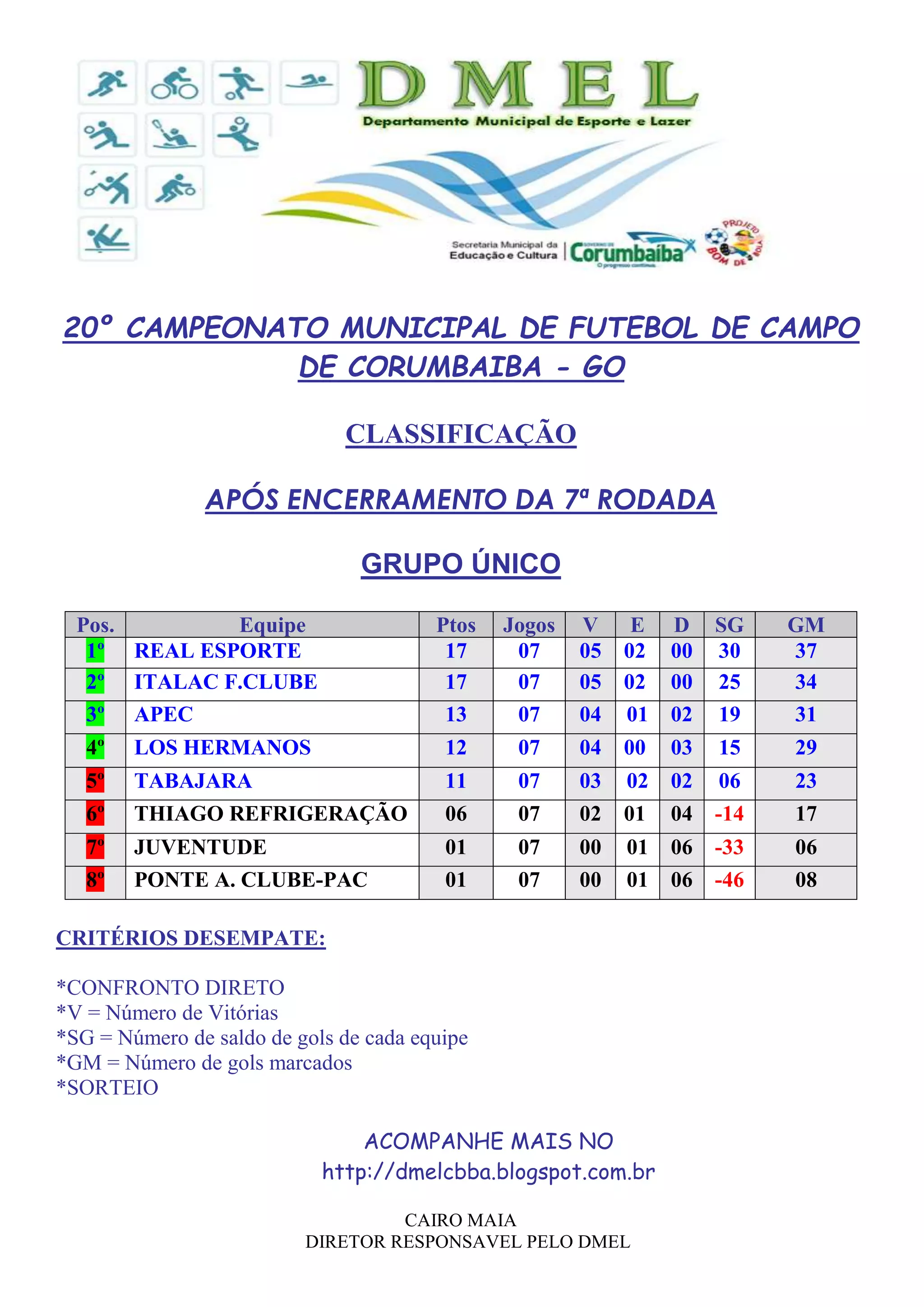 O documento apresenta a classificação após a 7a rodada do Campeonato Municipal de Futebol de Corumbaíba, Goiás. O Real Esporte lidera com 17 pontos e saldo de 30 gols, seguido pelo Itália F. Clube também com 17 pontos e saldo de 25 gols. O APEC ocupa a 3a posição com 13 pontos.