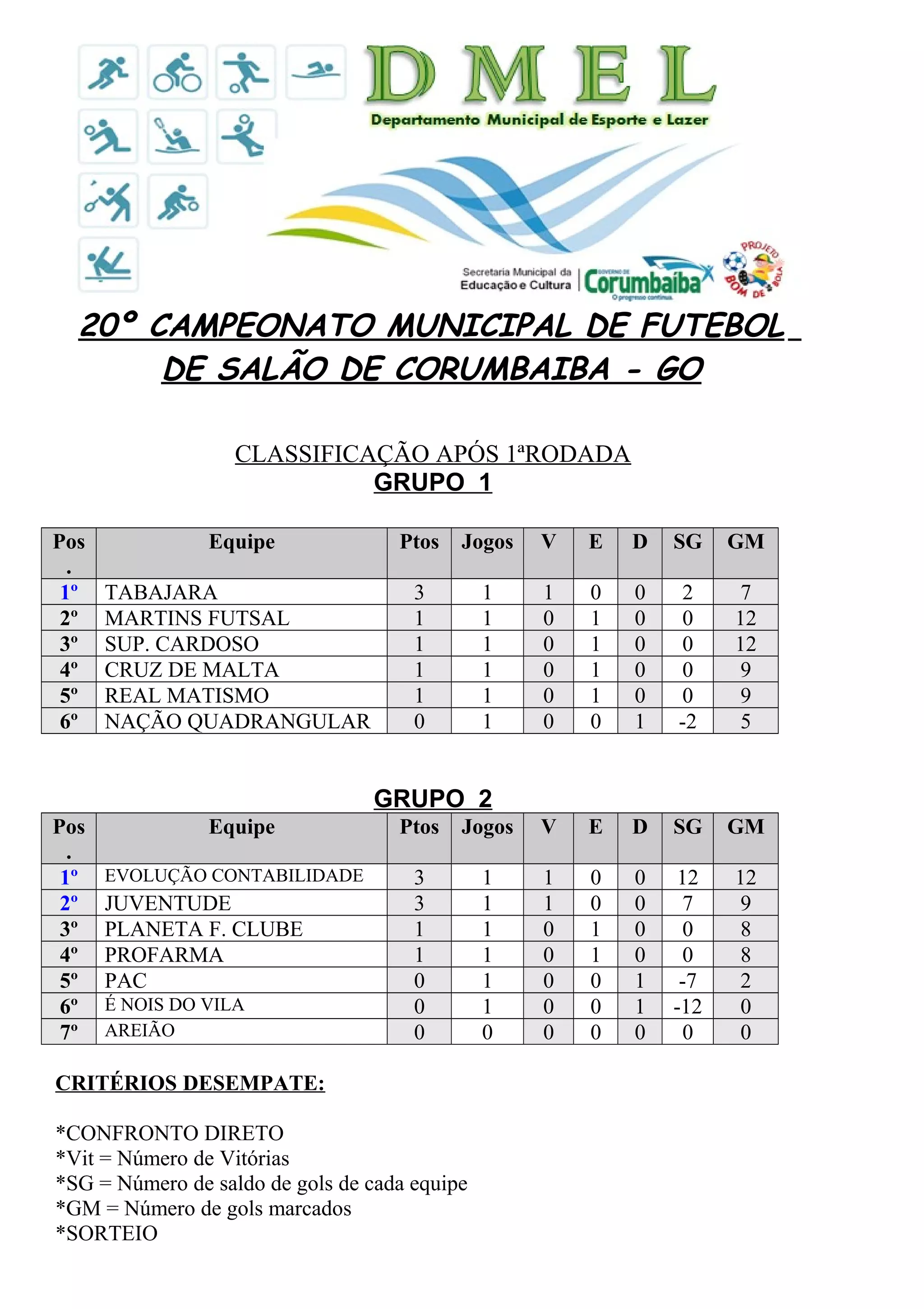 O documento apresenta a classificação após a primeira rodada do 20o Campeonato Municipal de Futebol de Salão de Corumbaíba - GO. No Grupo 1, o Tabajara lidera com 3 pontos e saldo de gols de 2, enquanto no Grupo 2 Evolução Contabilidade e Juventude estão empatados na primeira posição com 3 pontos cada. Os critérios de desempate em caso de empate na classificação são: confronto direto, número de vitórias, saldo de gols, gols marcados e sorteio.
