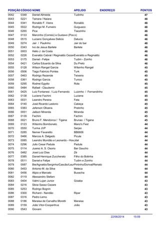 Este documento fornece uma lista de participantes de uma competição esportiva com seus nomes, endereços, pontuações, códigos e apelidos. A lista contém informações de 252 participantes.