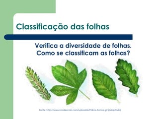 As folhas podem ser classificadas de acordo com sua forma, margem, e disposição das nervuras. Quanto à forma, as folhas podem ser inteiras ou recortadas, e quanto às nervuras, podem ser uninérveas, paralelinérveas, peninérveas ou palminérveas.