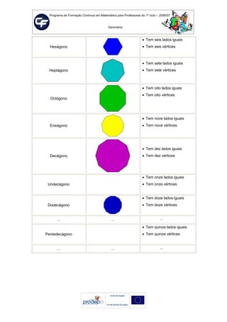 O documento define e fornece exemplos de polígonos regulares e não regulares, incluindo triângulos e quadriláteros. Descreve as propriedades de polígonos comuns como triângulos equiláteros, isósceles, escalenos, retângulos, quadrados e losangos.
