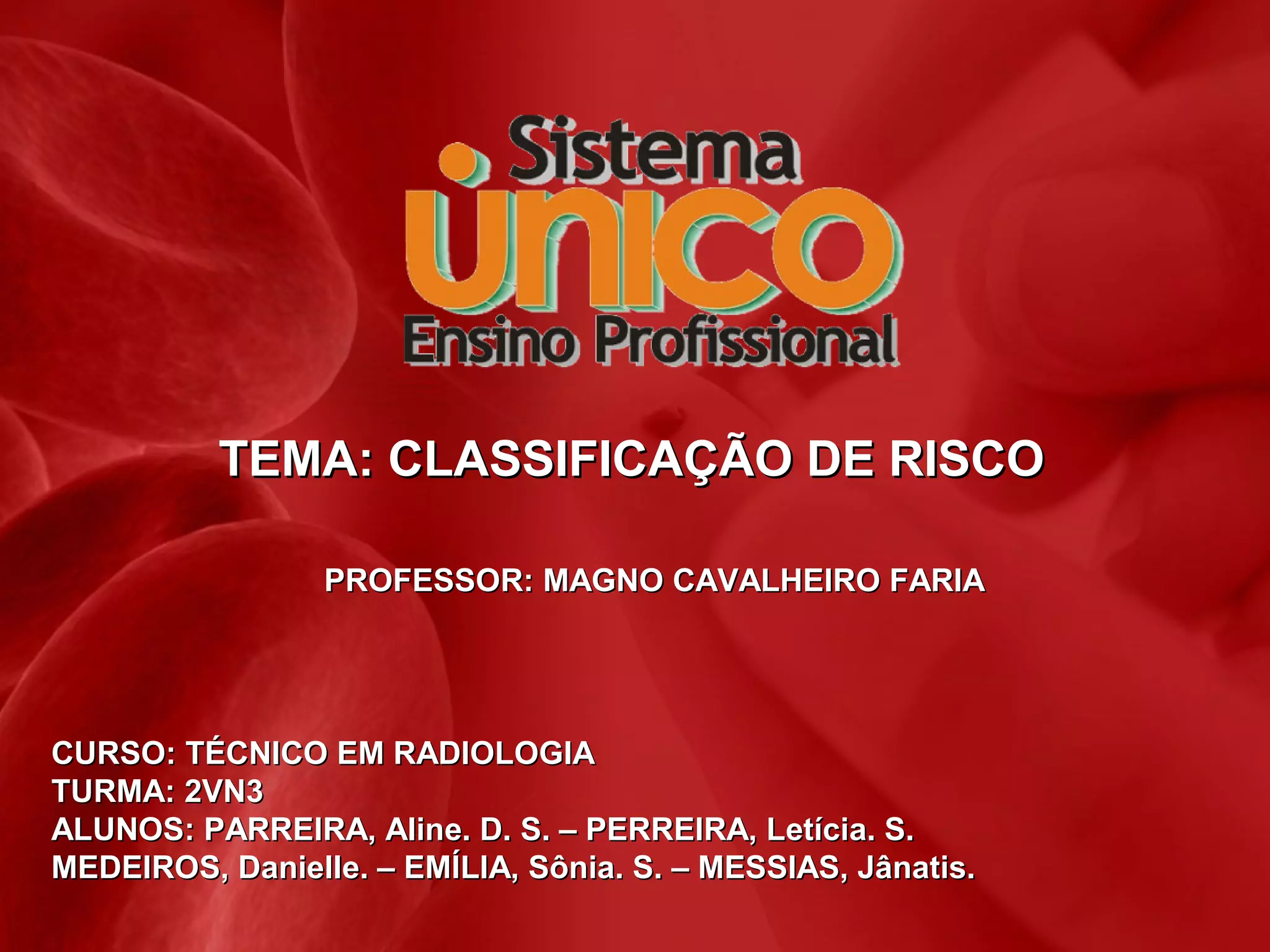 O documento descreve a classificação de risco implantada nos serviços de urgência e emergência no Brasil. A classificação categoriza os pacientes em vermelho (emergência), amarelo (urgência), verde (pouca urgência) e azul (não urgência) de acordo com o grau de risco, priorizando os casos mais graves para atendimento rápido e melhorando o fluxo de atendimento.