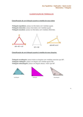 O documento classifica triângulos de acordo com a medida de seus lados em equilátero, isósceles ou escaleno e de acordo com a medida de seus ângulos em acutângulo, retângulo ou obtusângulo, explicando cada tipo.