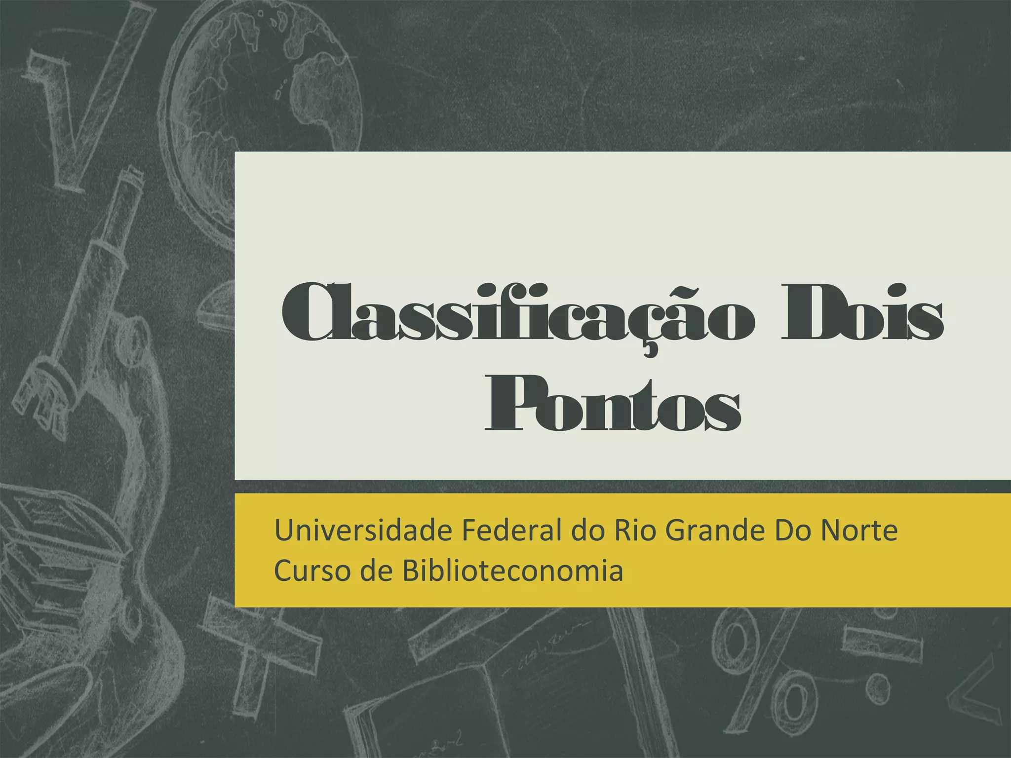 O documento descreve a classificação de dois pontos desenvolvida por Ranganathan, incluindo suas principais características como a análise de facetas e o uso do dois pontos. A classificação é autoperpetuante e permite formar novos números de classificação à medida que surgem novos assuntos, além de possibilitar a modificação de classes básicas de duas maneiras. A notação do sistema utiliza diversos símbolos como letras, números e pontuação.