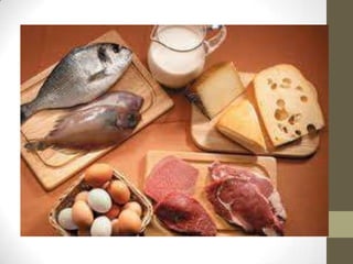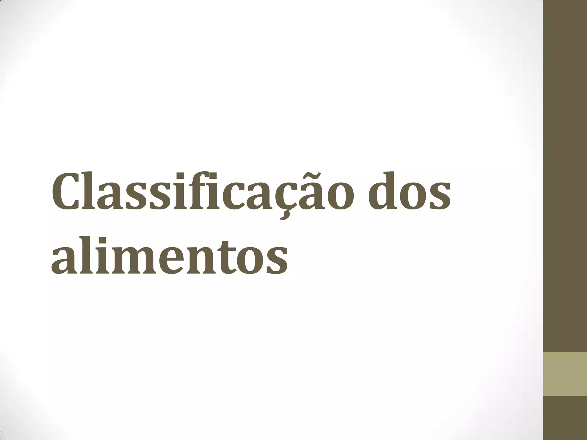 O documento classifica e descreve os principais tipos de alimentos. Apresenta carboidratos como principal fonte de energia, proteínas como essenciais para o crescimento, vitaminas como substâncias orgânicas necessárias, água como fundamental para o metabolismo, e sais minerais como essenciais para o funcionamento do organismo.