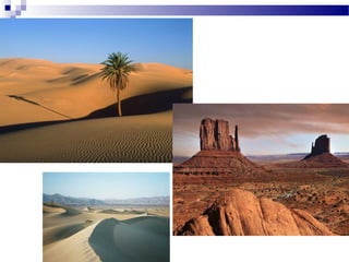 O documento classifica e descreve os principais tipos de ecossistemas terrestres e aquáticos, incluindo tundra, taiga, florestas temperadas, desertos, mangues, oceanos, rios e solos. Ele explica as características-chave de cada ecossistema, como a vegetação, clima e adaptações da vida selvagem.