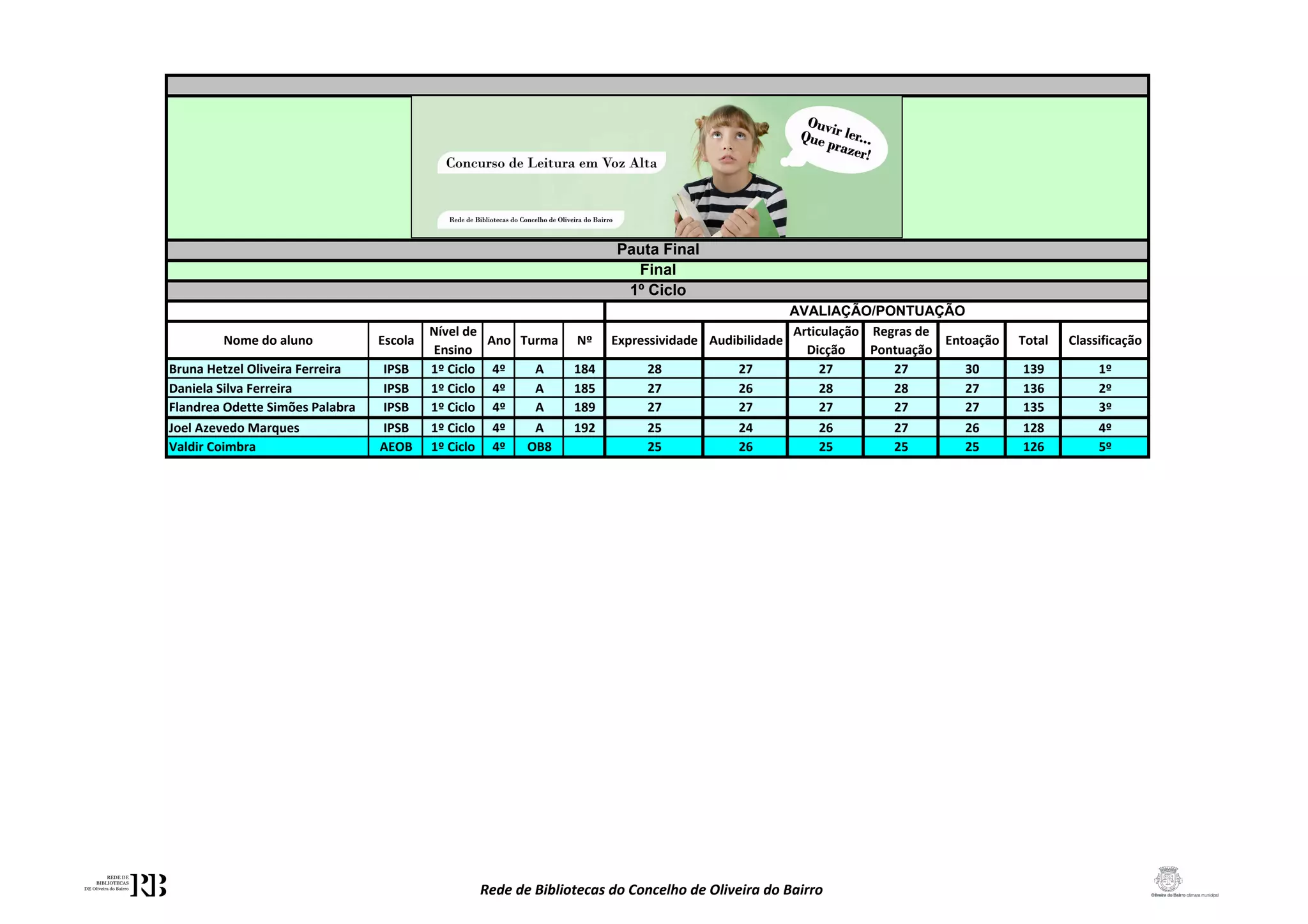 Bruna Hetzel Oliveira Ferreira ficou em 1o lugar na avaliação de canto com 139 pontos. Daniela Silva Ferreira ficou em 2o lugar com 136 pontos e Flandrea Odette Simões Palabra ficou em 3o lugar com 135 pontos. Os demais alunos ficaram em 4o e 5o lugar.