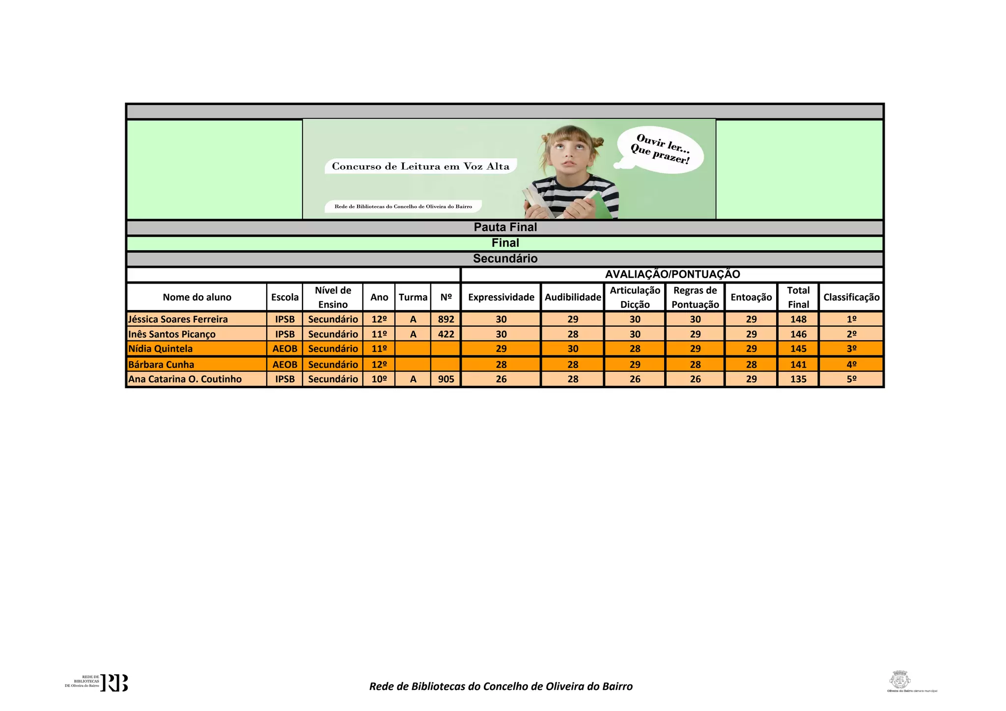 Jéssica Ferreira ficou em 1o lugar na avaliação de expressividade e articulação com 148 pontos. Inês Picanço ficou em 2o com 146 pontos. Nídia Quintela ficou em 3o com 145 pontos.