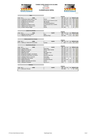 O documento apresenta os resultados da classificação geral do Torneio Verão Brasília de Ciclismo nas categorias Elite Masculino, Sub 23, Master A, Master B e Master C. Marconi Soares Ribeiro ficou em primeiro lugar na categoria Elite Masculino e Marconi Fernandes Costerus ficou em primeiro na categoria Master C.