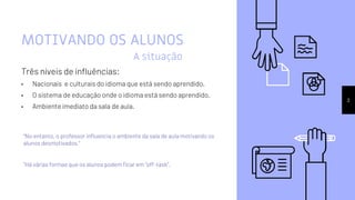 O documento discute estratégias de motivação e gerenciamento de alunos em sala de aula. Ele apresenta três níveis de influência na motivação dos alunos, formas de manter os alunos engajados nas atividades e como lidar com alunos específicos. O documento defende que o professor é capaz de influenciar positivamente o ambiente da sala de aula para melhor aproveitar as oportunidades de aprendizagem.