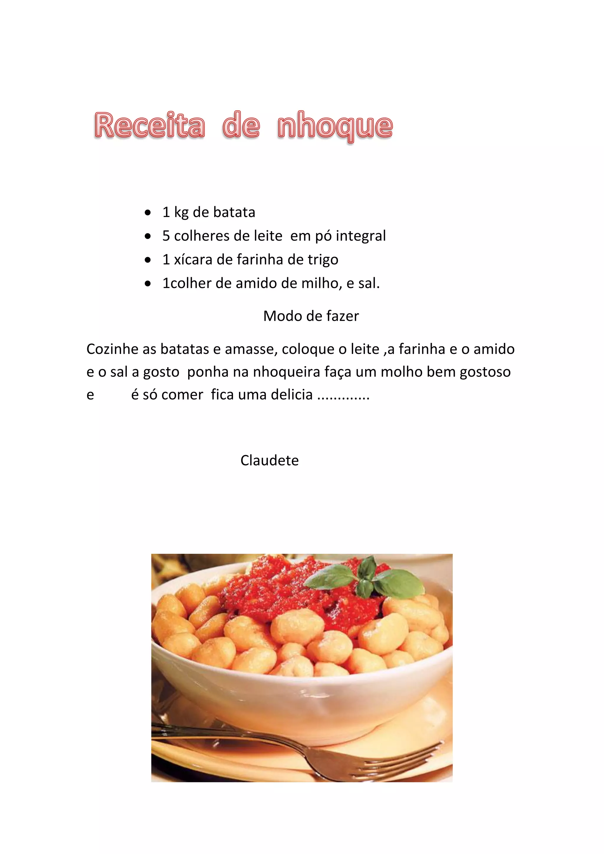Este documento fornece uma receita simples para nhoque caseiro que inclui 1 kg de batata cozida e amassada, 5 colheres de leite em pó integral, 1 xícara de farinha de trigo, 1 colher de amido de milho e sal, misturados para serem prensados e servidos com um molho gostoso.