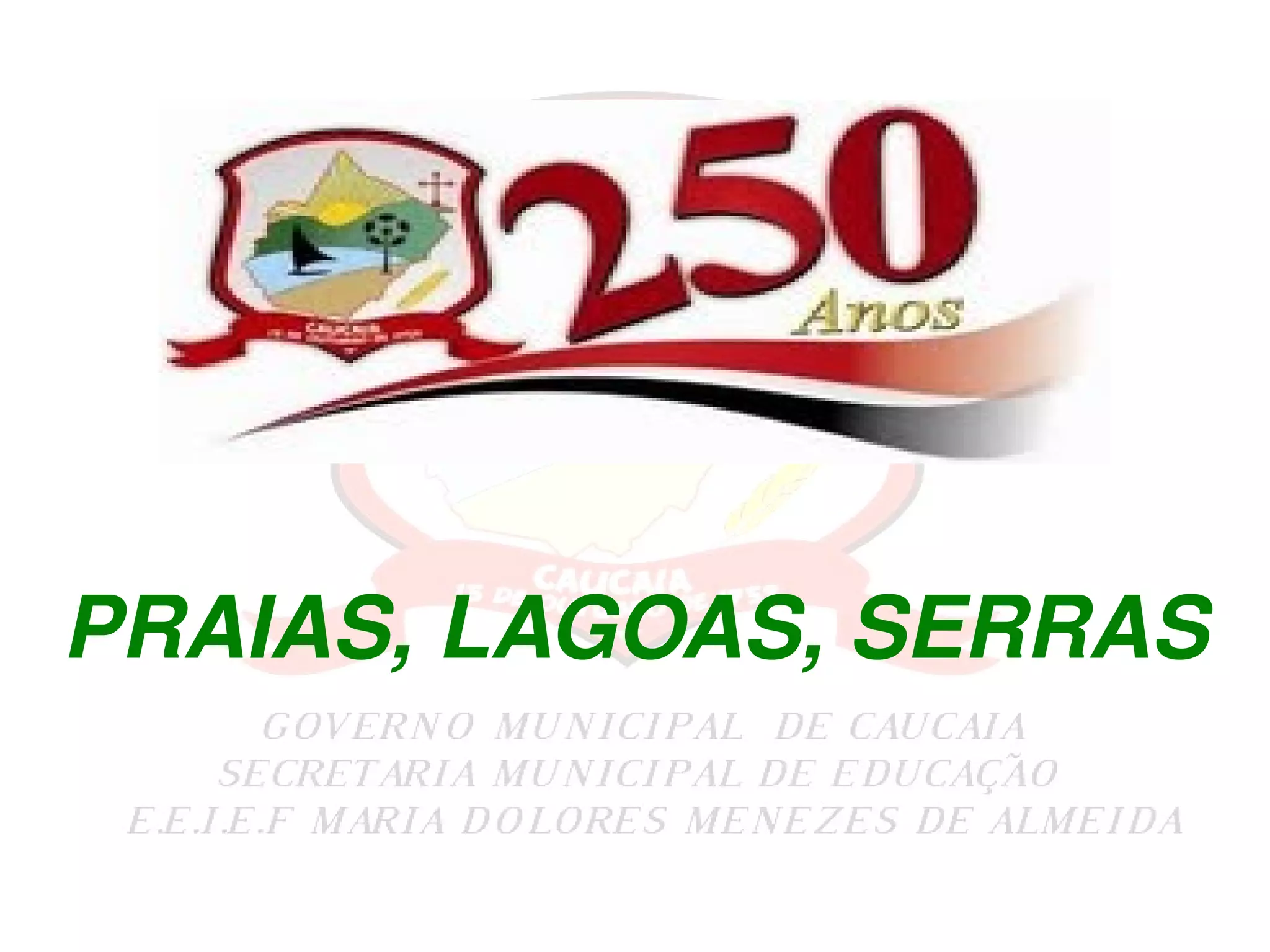 O documento descreve as praias, lagoas e serras da região de Caucaia no Ceará. Detalha as características climáticas da região litorânea, apresenta algumas das praias mais famosas como Cumbuco, Icaraí e Iparana, e descreve locais como a Lagoa do Banana, a Barra do Cauípe e a Serra da Rajada. Também menciona iniciativas de promoção do turismo na região.