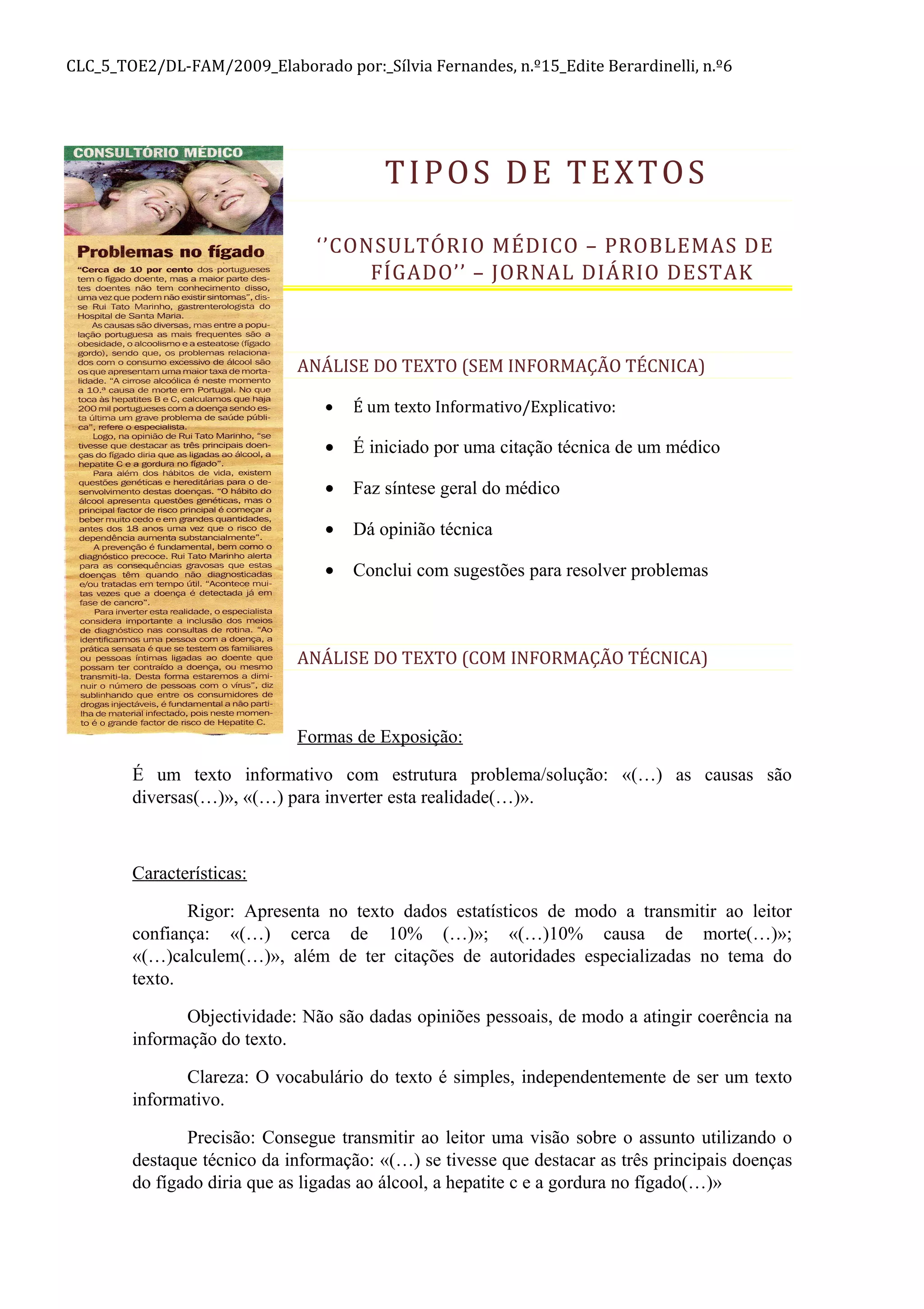 Este documento analisa dois textos diferentes. O primeiro texto é sobre problemas de fígado e é classificado como informativo/explicativo. O segundo texto é uma análise de um espetáculo teatral e é classificado como expositivo e descritivo. Ambos os textos são analisados em termos de estrutura, características, etapas e aspectos valorativos.