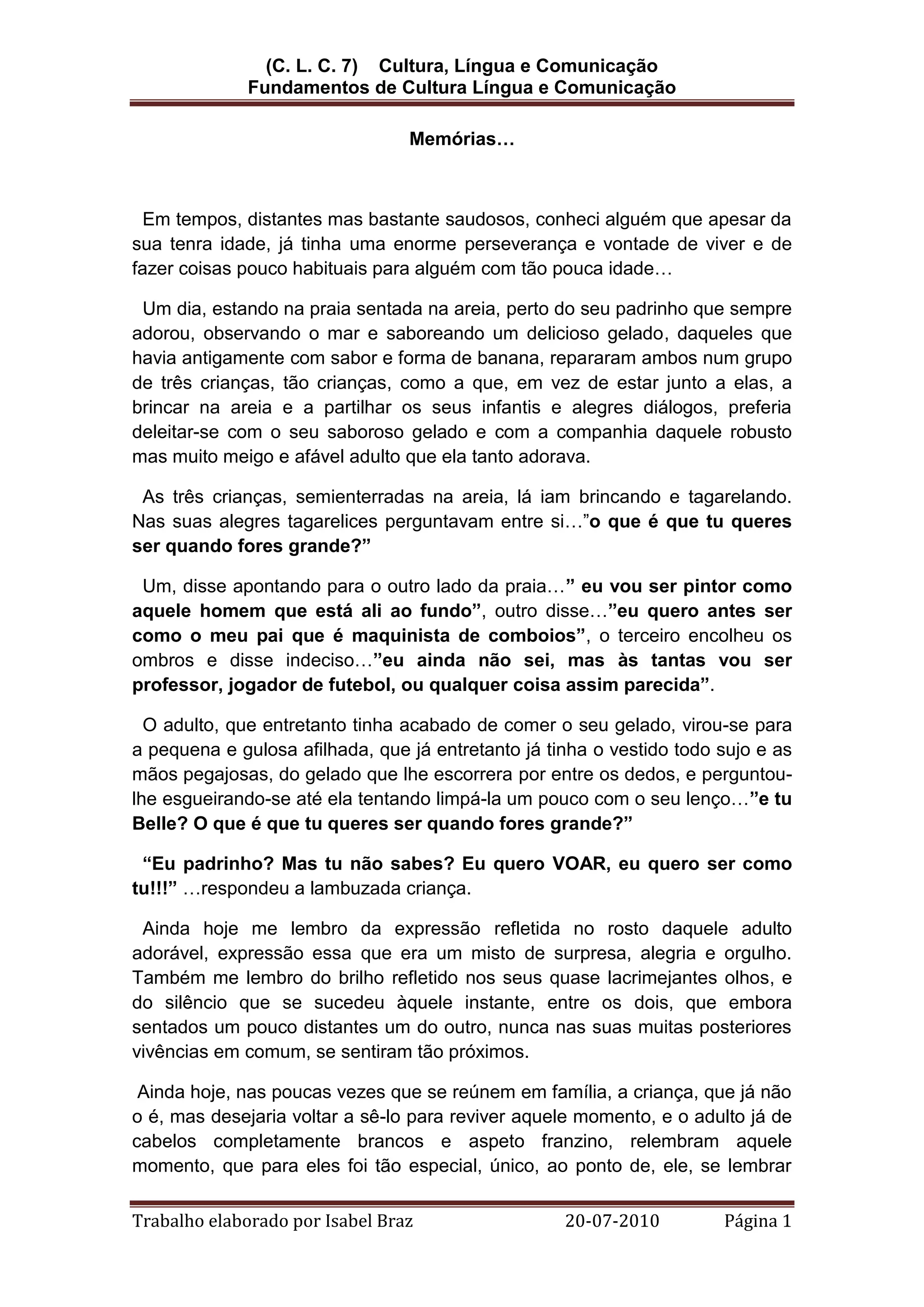 Este documento descreve uma memória de infância. Uma menina estava na praia com seu padrinho favorito, comendo um gelado. Quando outras crianças discutiam o que queriam ser quando crescessem, o padrinho perguntou à menina o que ela queria ser. Ela respondeu que queria "voar" e ser como ele. Tanto a menina quanto o padrinho ainda se lembram desse momento especial.
