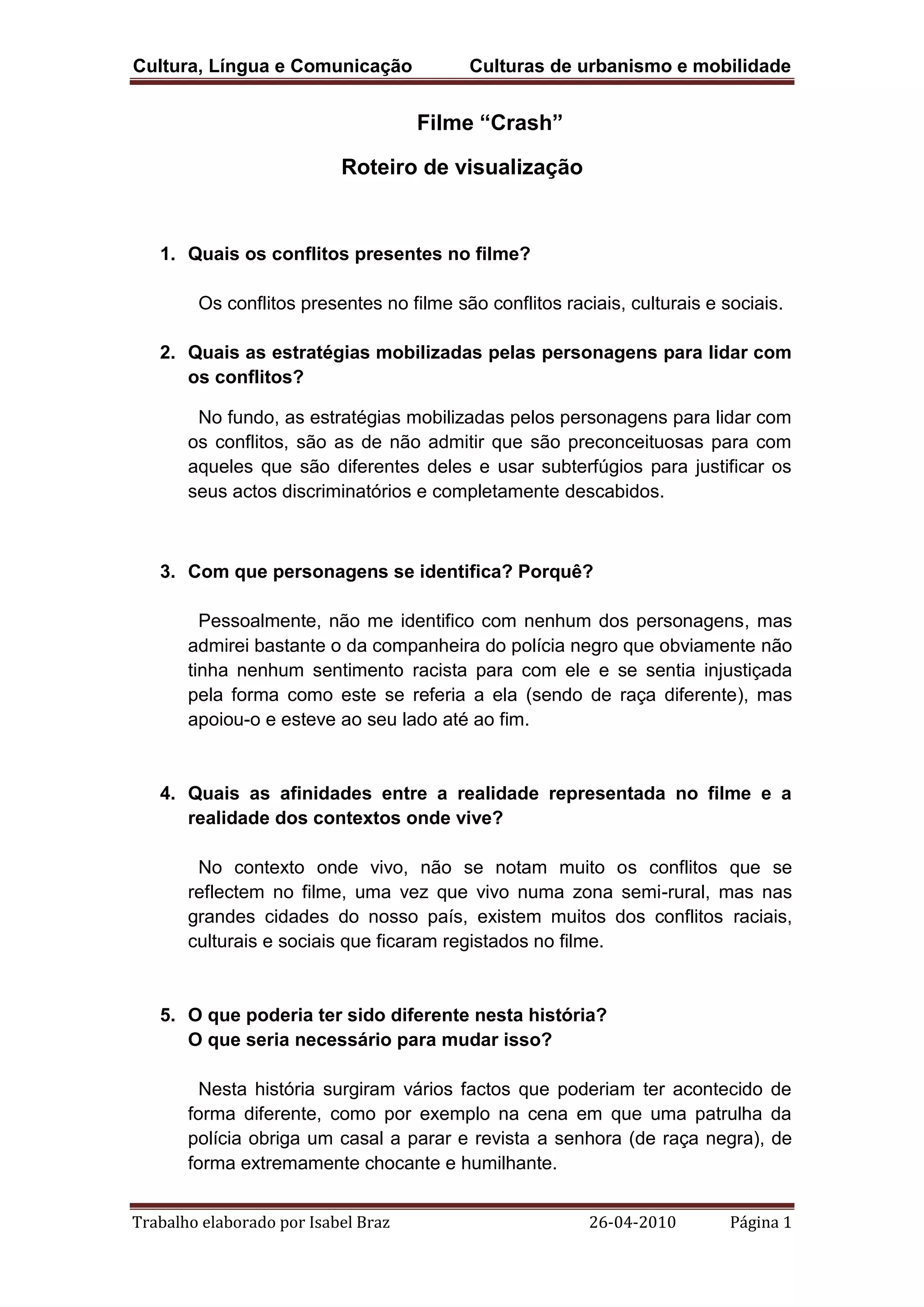 O filme "Crash" explora conflitos raciais, culturais e sociais entre personagens de diferentes origens. As personagens lidam com esses conflitos negando preconceitos e justificando atos discriminatórios. Uma personagem admirada é a companheira do policial negro que o apoiou apesar de raças diferentes. Enquanto grandes cidades refletem esses conflitos, a área rural onde o autor vive não. Melhorias poderiam incluir tratamento igualitário pela polícia sem maus-tratos.