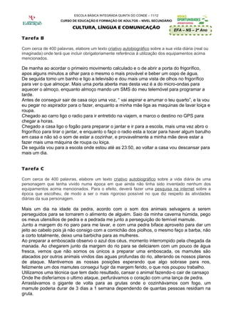 Este documento apresenta quatro tarefas relacionadas com equipamentos e sua utilização no dia a dia. Na Tarefa A, o aluno ordena 16 equipamentos de acordo com sua importância e justifica sua resposta. Nas Tarefas B e C, o aluno escreve textos criativos sobre a vida diária de uma personagem atual e de outra de época pré-histórica. Na Tarefa D, o aluno deve fazer uma apresentação sobre a origem e evolução de um equipamento.