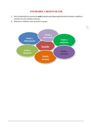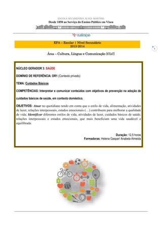 O documento descreve um programa educativo de 12,5 horas sobre cuidados básicos de saúde em contexto doméstico para estudantes do ensino secundário. O programa aborda tópicos como estilo de vida saudável, alimentação, atividades de lazer, relações interpessoais e saúde mental, com o objetivo de melhorar a qualidade de vida dos estudantes. As atividades incluem discutir a definição de saúde da OMS e trabalhar em grupos temas como saúde e alimentação, desporto, prevenção