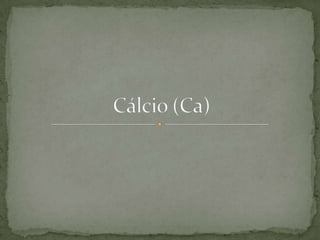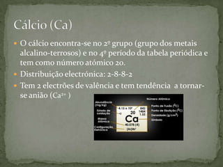 O cálcio é um metal alcalino-terroso encontrado no grupo 2 e período 4 da tabela periódica, com número atômico 20. Ele se encontra em alimentos e nos ossos dos vertebrados, sendo essencial para a formação óssea humana, e sua falta pode levar a osteoporose.