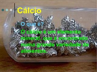 O documento aborda o cálcio e o fósforo, destacando suas fontes alimentares e funções essenciais no organismo, como a formação de ossos e dentes. Ele também menciona os problemas de saúde associados ao excesso e à deficiência desses minerais, incluindo doenças como raquitismo e osteoporose. Por fim, são fornecidas referências para mais informações sobre o tema.