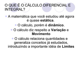 1) O cálculo é um ramo da matemática que trata de limites e conceitos dinâmicos como variação e movimento.