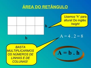 O documento apresenta fórmulas para calcular áreas de diferentes figuras geométricas planas como retângulo, quadrado, triângulo, paralelogramo, losango e trapézio. Explica que a área do retângulo é dada por base vezes altura, do quadrado é o lado ao quadrado, e do triângulo é metade da área do retângulo equivalente. Para o paralelogramo e losango, desenha figuras equivalentes a retângulos. E para o trapézio, transforma-o em paralelogra