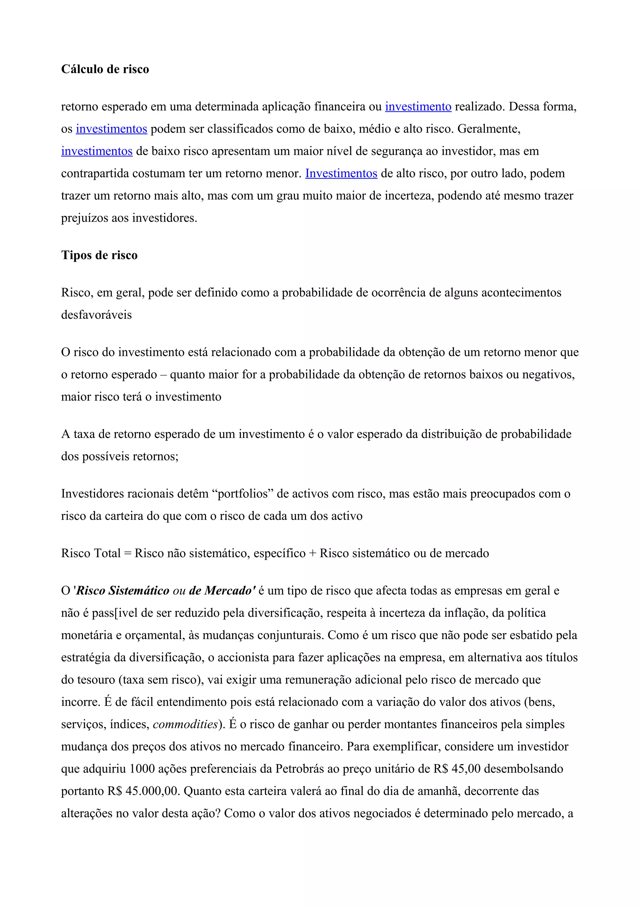 O documento discute vários tipos de risco de investimento, incluindo risco de mercado, risco específico, risco de crédito e risco de negócio. Explica como a diversificação pode reduzir o risco específico, mas não o risco sistemático. Também cobre como medir o grau de alavancagem operacional e financeira para avaliar o risco de uma empresa.