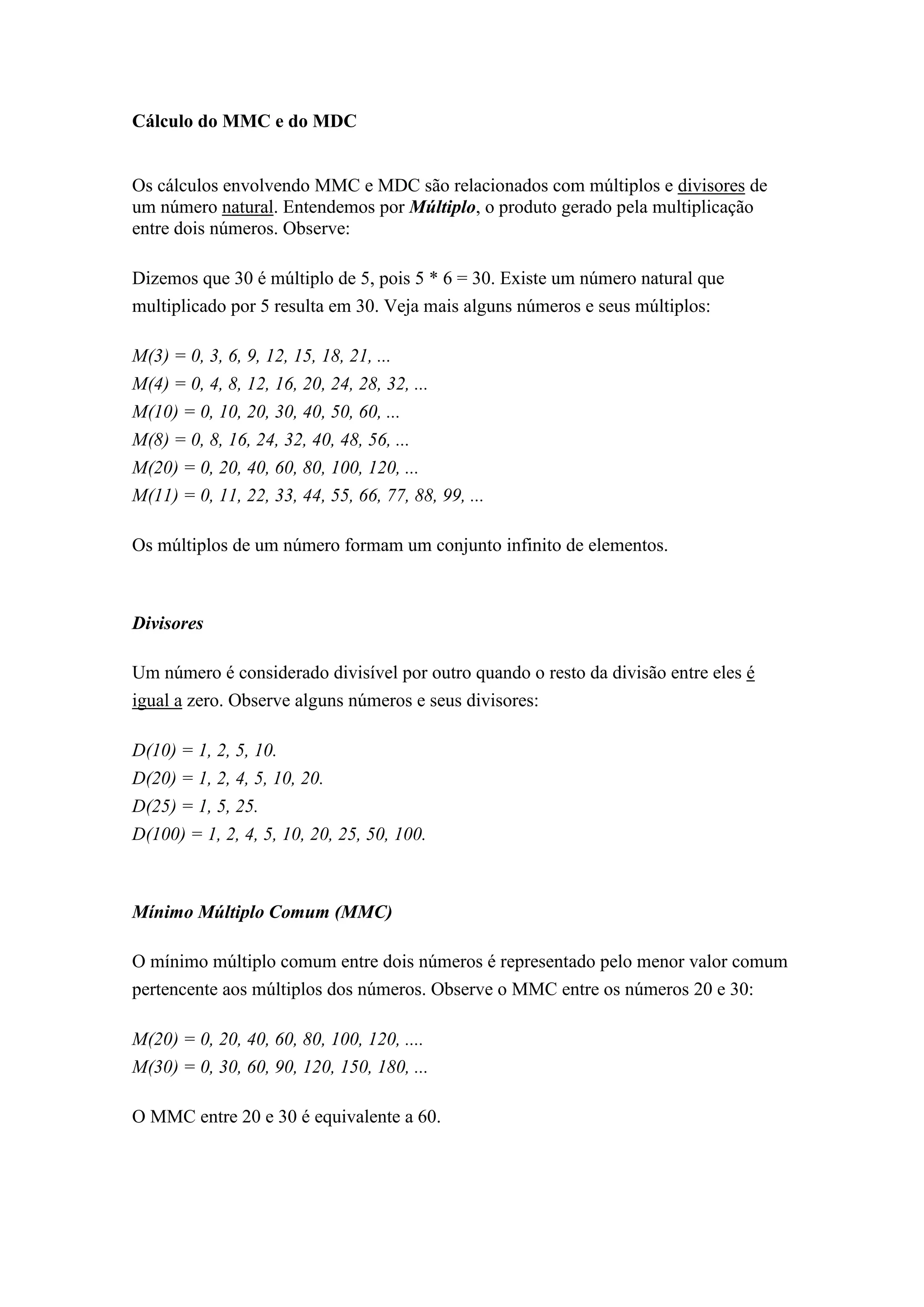 1) O documento explica os conceitos de Mínimo Múltiplo Comum (MMC) e Máximo Divisor Comum (MDC), que são usados para calcular o menor número que é múltiplo de dois números e o maior número que divide dois números, respectivamente.