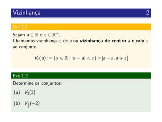 Este documento apresenta os conceitos fundamentais de limites e continuidade de funções de uma variável real. Na primeira seção, define-se vizinhança e os conceitos de ponto interior, exterior e fronteiro de um conjunto. Posteriormente, introduzem-se as noções de conjunto aberto, fechado e compacto. As seções seguintes abordam pontos de acumulação, isolados e limites de funções segundo Cauchy e Heine. Por fim, discutem-se propriedades dos limites, limites laterais, limites infinitos e no infinito.
