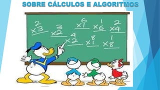 O documento discute diferentes tópicos relacionados ao ensino e aprendizagem de cálculos e algoritmos matemáticos na educação infantil e anos iniciais. Aborda a importância de situar os cálculos em problemas autênticos para desenvolver a compreensão conceitual, estimular estratégias pessoais de resolução e evitar a mera repetição. Também discute técnicas como contagem, propriedades das operações, memorização de fatos numéricos e o uso de materiais manipulativos e algoritmos tradicionais de forma significativa para