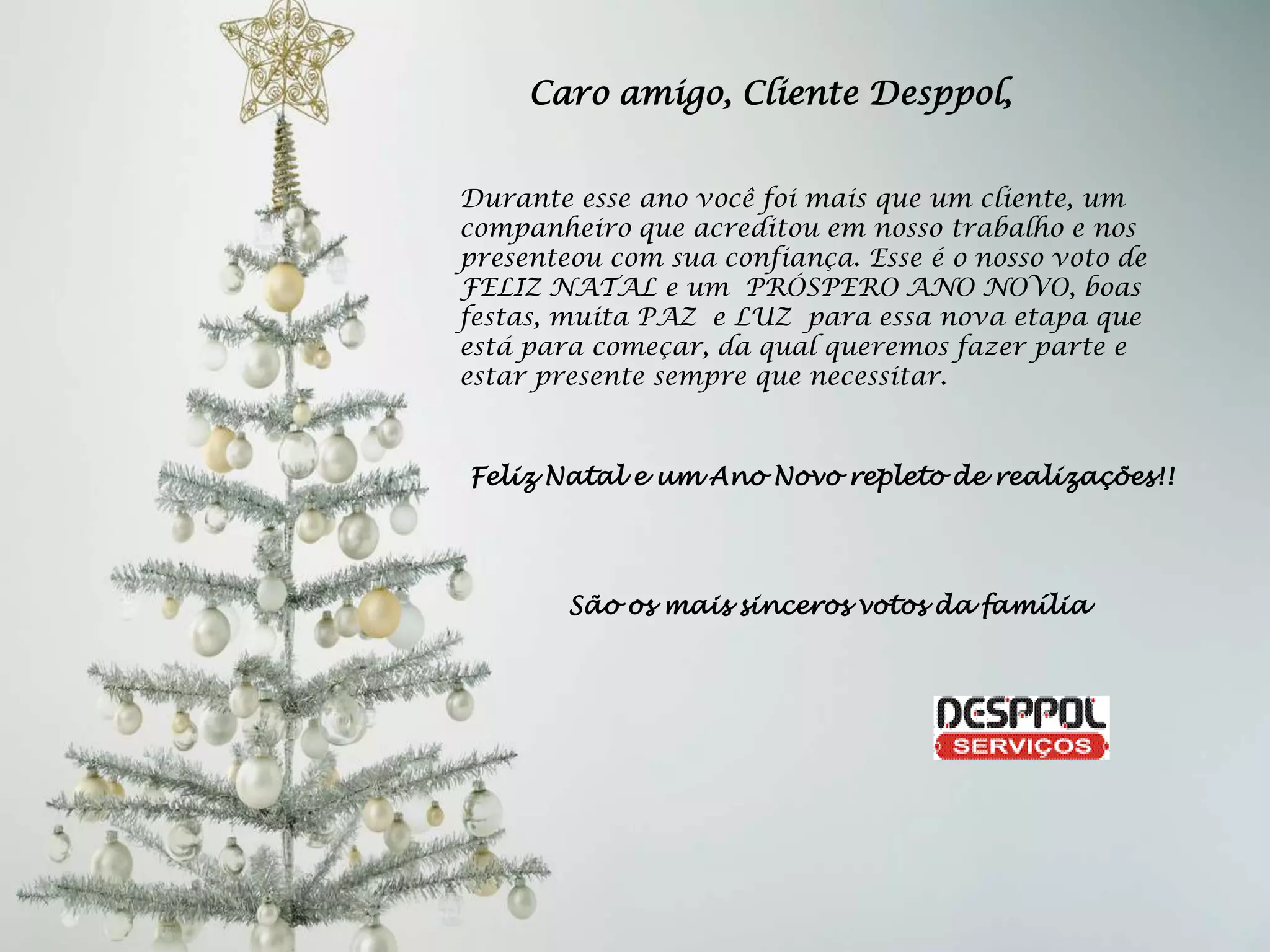 Caro amigo, ClienteDesppol, Durante esse ano você foi mais que um cliente, um companheiro que acreditou em nosso trabalho e nos presenteou com sua confiança. Esse é o nosso voto de FELIZ NATAL e um PRÓSPERO ANO NOVO, boas festas, muita PAZ e LUZ para essa nova etapa que está para começar, da qual queremos fazer parte e estar presente sempre que necessitar. Feliz Natal e um Ano Novo repleto de realizações!! São os mais sinceros votos da família