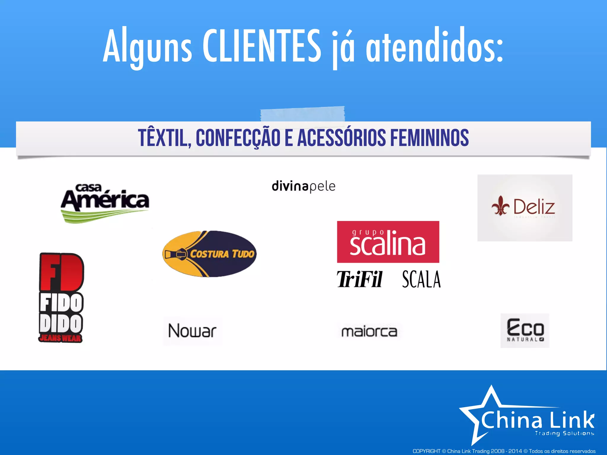 O documento apresenta a China Link Trading, fornecendo flexibilidade para pequenos clientes e estrutura para grandes, com informações de contato e links para saber mais sobre a empresa e seus clientes.
